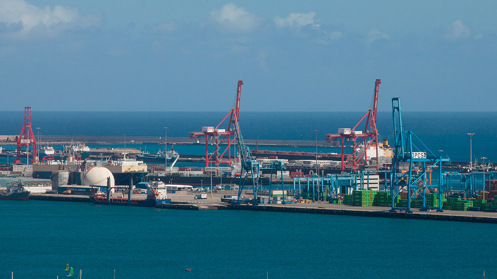 Sitze in der öffentlichen Bibliothek in Las Palmas, ein schmaler Fensterschlitz lässt den Hafen im extremen Cinemascope-Seitenverhältnis erscheinen. Ein Panorama mit der Weite und Ruhe, welche die Geschäftigkeit des Warentransfers, die anonymen Container und deren Gewicht nicht erkennen lässt. Einzig die Weite bleibt als beruhigendes Element.