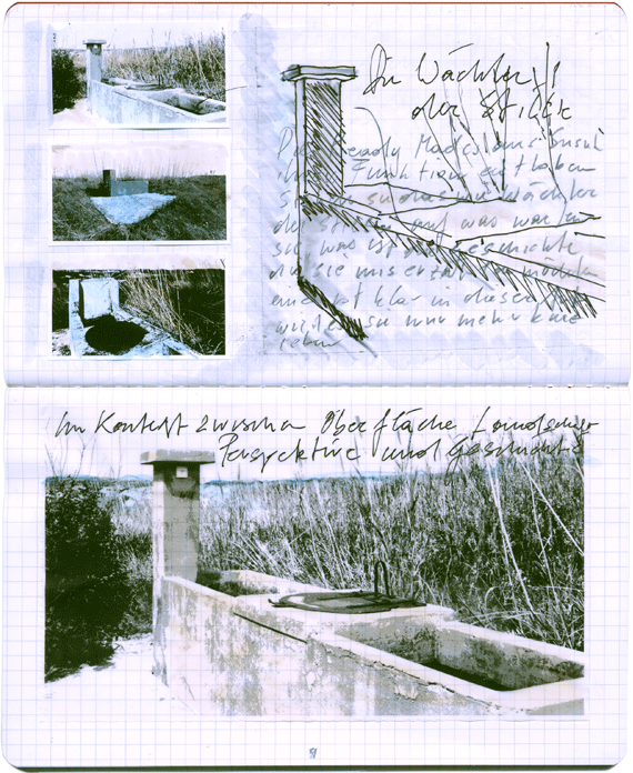 Die Skizzen unterstützen den Prozess, bringen Zeit und Verständnis und bilden gleichzeitig eine Aneignung der Skulpturen im Sinne der Ready Mades, wo es weniger um die Modulation des Vorhandenen geht sondern viel mehr um das stille Begreifen und den Aufbau einer Beziehung zu den stummen auf der Insel verweilenden abstrakten Wächtern. Zur Zeit werden sie für Wegmarkierungen, künstlerische Interventionen oder einfach als Orientierungspunkte für Wegbeschreibungen verwendet. Irgendwie hat man das Gefühl, dass sie auch noch funktionieren. Wahrscheinlich muss man sie einfach nur reinigen. Doch gerade dieser Zustand der fragilen Nichtnutzung wirkt anziehend.